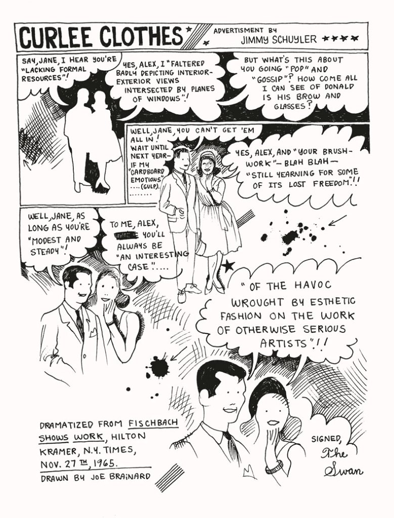 Brainard and co kept up a diatribe against Hilton Kramer, then the art critic of the New York Times, dubbing him Hilton ‘Albeit’ Kramer. They incorporated quotes from his reviews in romance-style comics about an all-American boy and girl at art school: ‘Say, Jane, I hear you’re “lacking formal resources”!’ ‘Yes, Alex, and “your brushwork” – blah blah – “still yearning for some of its lost freedom”!!’
