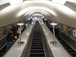 Right up until the last few seconds of the ride, all you can see of the platforms is a bright, almost blinding blast of light. Cultish floodlamps on thin but sturdy stems punctuate the central divisions of the three stainless steel escalators, standing to attention as you clank down the barrel vault to the trains. It’s a pleasure, even at morning rush hour.