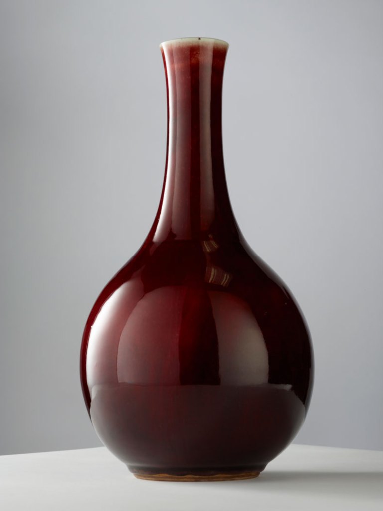 Of all the treasures in New York’s Morgan Library and Museum, one draws me in with singular force. A deep, gleaming red, it seems at once to contain and reflect light, like a jewel. Unlike a jewel, it stands 40cm high. With a long narrow neck and wider curving body, it is a Chinese porcelain bottle vase that dates from the Kangxi reign (1662–1722) of the Qing dynasty and is now called the Morgan Ruby. Its placement on a plinth near a floor-to-ceiling window affords 360-degree views of its flawless surface and intense colour in natural light. The monochrome copper-oxide glaze, which is notoriously hard to control, has to be fired in wood-burning kilns, with reduced oxygen, at extremely high temperatures. The Chinese describe the colour as langyaohong (‘official-kiln red’); some Western experts call it oxblood (sang de boeuf).