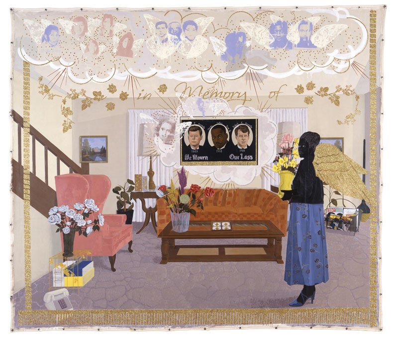 As the show’s title suggests, Marshall has a particular interest in the once-privileged genre of history painting, a mode he has been repurposing and occasionally subverting since at least the 1990s. The most arresting examples on display here explore grand historical narratives through microcosmic settings, rendering them on unstretched canvas at heroic scale. Consider the barbershop – an emblematic space of ‘sanctuary’ for the African-American community in Los Angeles – imagined in De Style (1993), in which a calendar hanging on the wall indicates the date of Rodney King’s beating at the hands of the LAPD; or the domestic scenes in the Souvenir series (1997), all of which are decorated with homages to deceased heroes of the Civil Rights movement – some diegetic (wall hangings with a distinctly home-made touch); some less anchored in realism, captured as clouds of text or screen-printed images hovering at the upper fringes of the pictorial space.