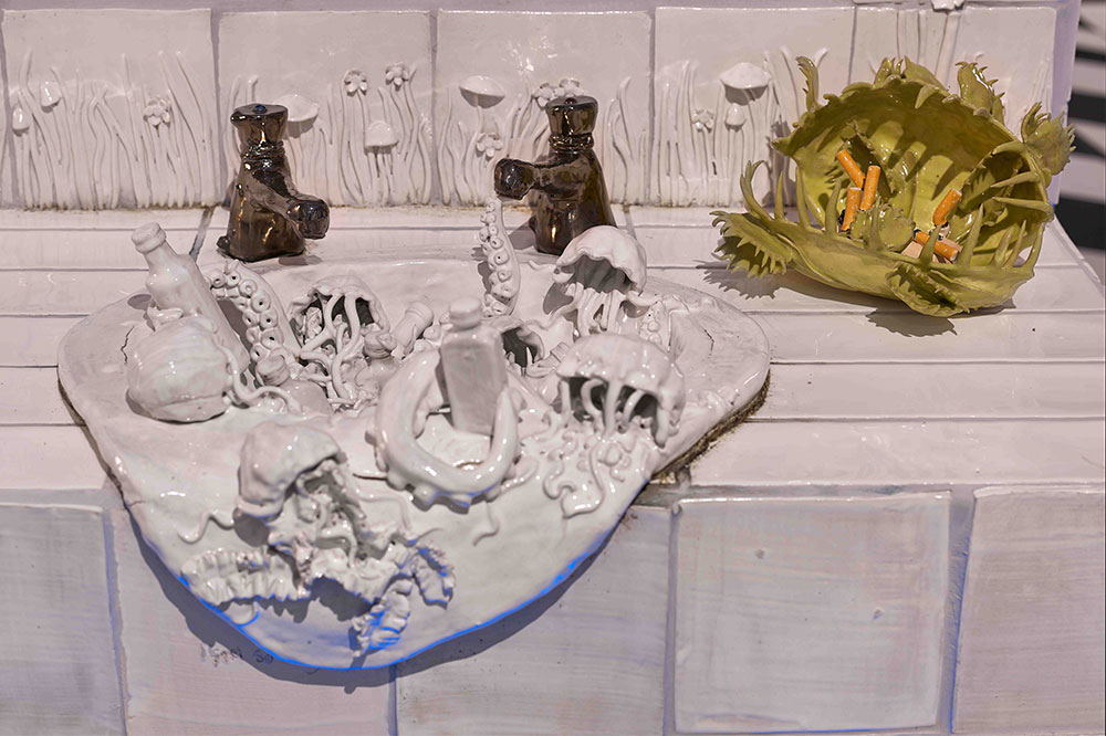 The Margate-based ceramic artist Lindsey Mendick tackles taboo topics and uncomfortable truths with wit and candour. For her first solo exhibition in Scotland, at Jupiter Artland in Edinburgh (until 1 October), Mendick draws inspiration from Robert Louis Stevenson’s gothic novella The Strange Case of Dr Jekyll and Mr Hyde (1886) to explore contemporary issues around public shaming and binge drinking. The show takes the form of a large-scale diptych installation spread across Jupiter’s Ballroom and Steadings Galleries. In the Ballroom Gallery, the end of a raucous dinner party plays out upon a mirrored dining table, which reflects the grotesque appearances of dinner guests as represented through a series of anthropomorphic vases. Meanwhile, a disorientating nightclub scene – complete with urinals and toilets – is rendered in the Steadings Gallery. Find out more on Jupiter Artland’s website.