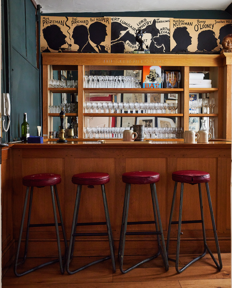 The bar, or ‘Sketchers’ Arms’, at the Sketch Club, with ceramic tankards made at the Fulham Pottery. Photo: Laura Hodgson, courtesy ACC ART Books