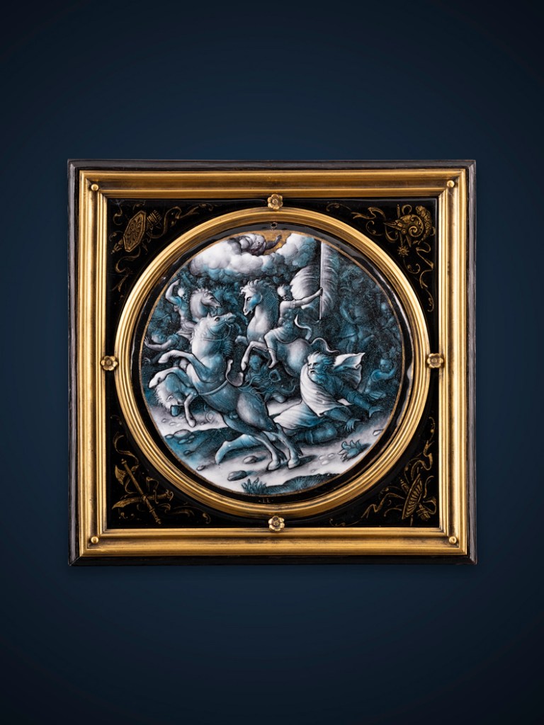 Mythological and secular scenes and portraits prevailed, and the brilliance of blues and greens became less dominant than the grisaille or monochrome enamels, where black-and-white was enhanced by subtle flesh tones and softer hues, often with gold highlights. These combine detailed figural scenes with often fantastical ornament, their compositions – like those of Italian maiolica – derived from prints. Limoges’s great makers and dynastic workshops are well represented here, but it is the collectors who take centre stage – kings, princes, plutocrats, connoisseurs and adventurers. Testimony to the value that these works of art were often accorded is that in 1916, the prominent American collector Henry Clay Frick paid more for J.P. Morgan’s 40 Limoges enamels – $1,157,500 – than for any other purchase he ever made, save Fragonard’s Progress of Love series. Bellini’s masterpiece Saint Francis in the Desert cost him a mere $170,000.