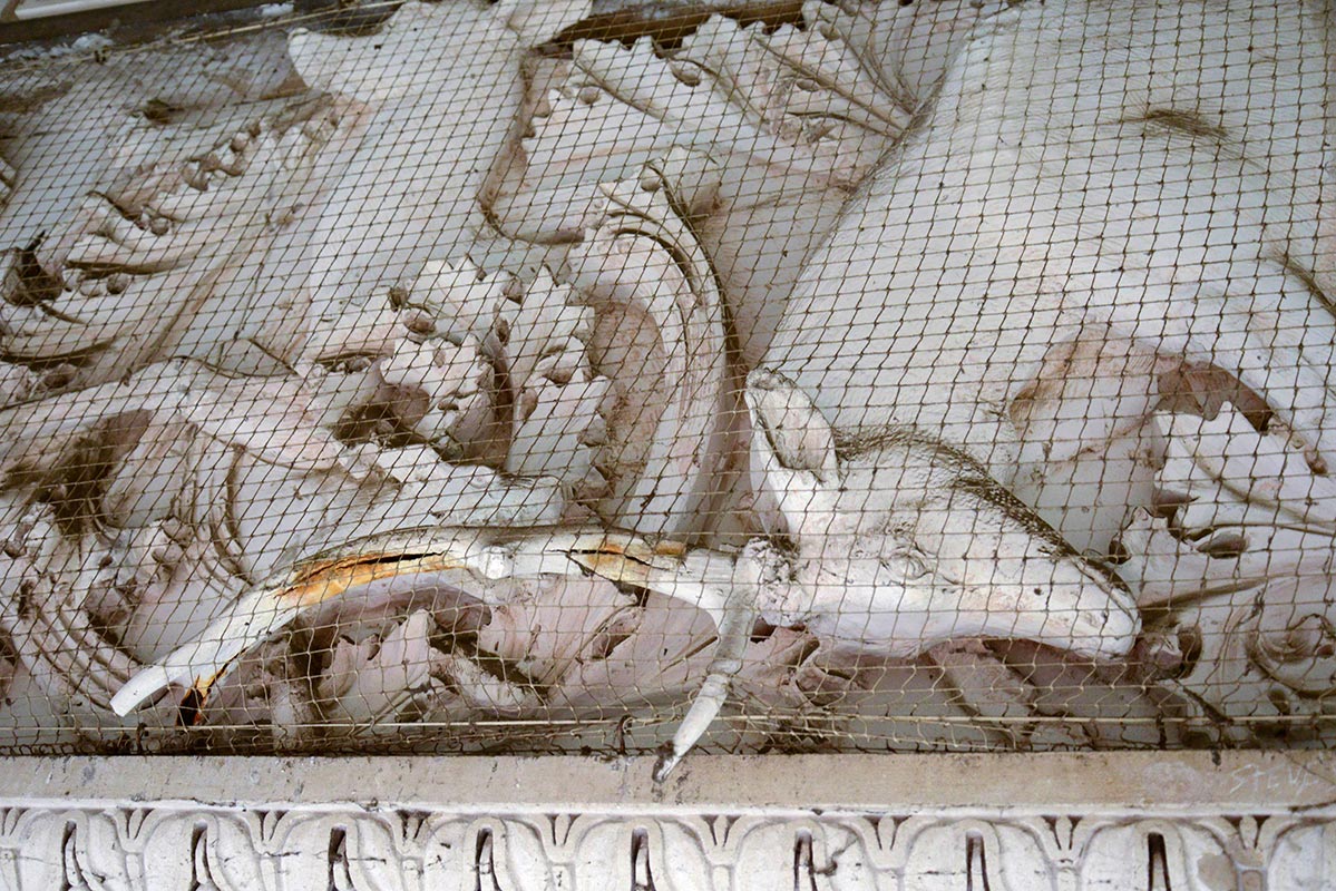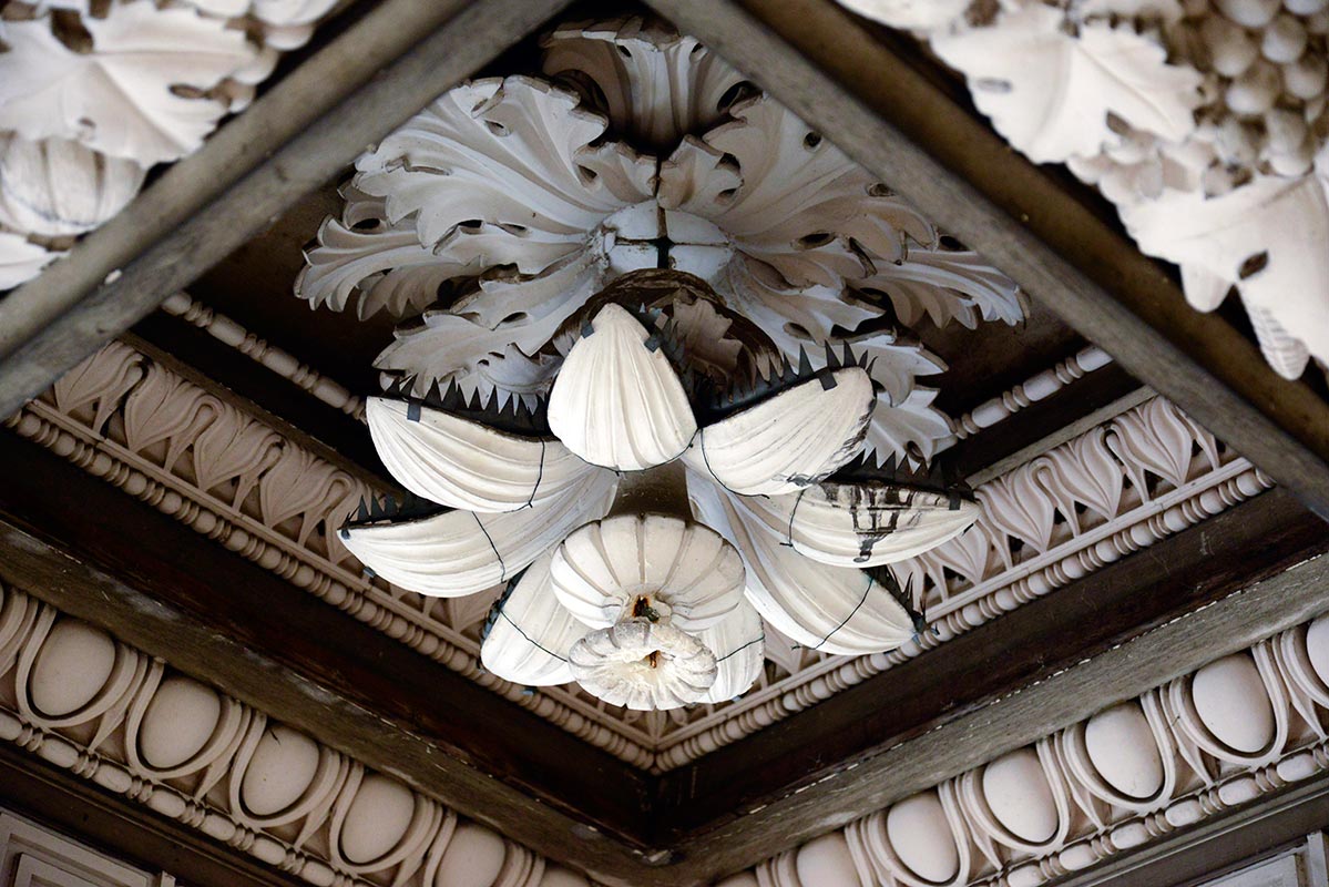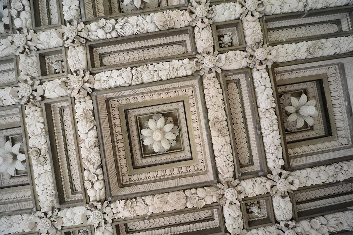 The portico’s careful restoration has saved it from potential catastrophe: leaks from the roof had severely undermined the structural integrity of the plastered coffered ceiling, with the giant plaster lotus flowers even menacing to fall. They not only risked shattering on the ground but maybe even on a visitor’s head. The restoration also helps to highlight the coherence of the original design. Visitors can now clearly progress from the railings on the street with their pineapple finials, to the plastered coffered ceiling repeating the motif along with a variety of plump fruit, lush foliage and wild animals, to the refinement and sheer exuberance of the entrance hall.