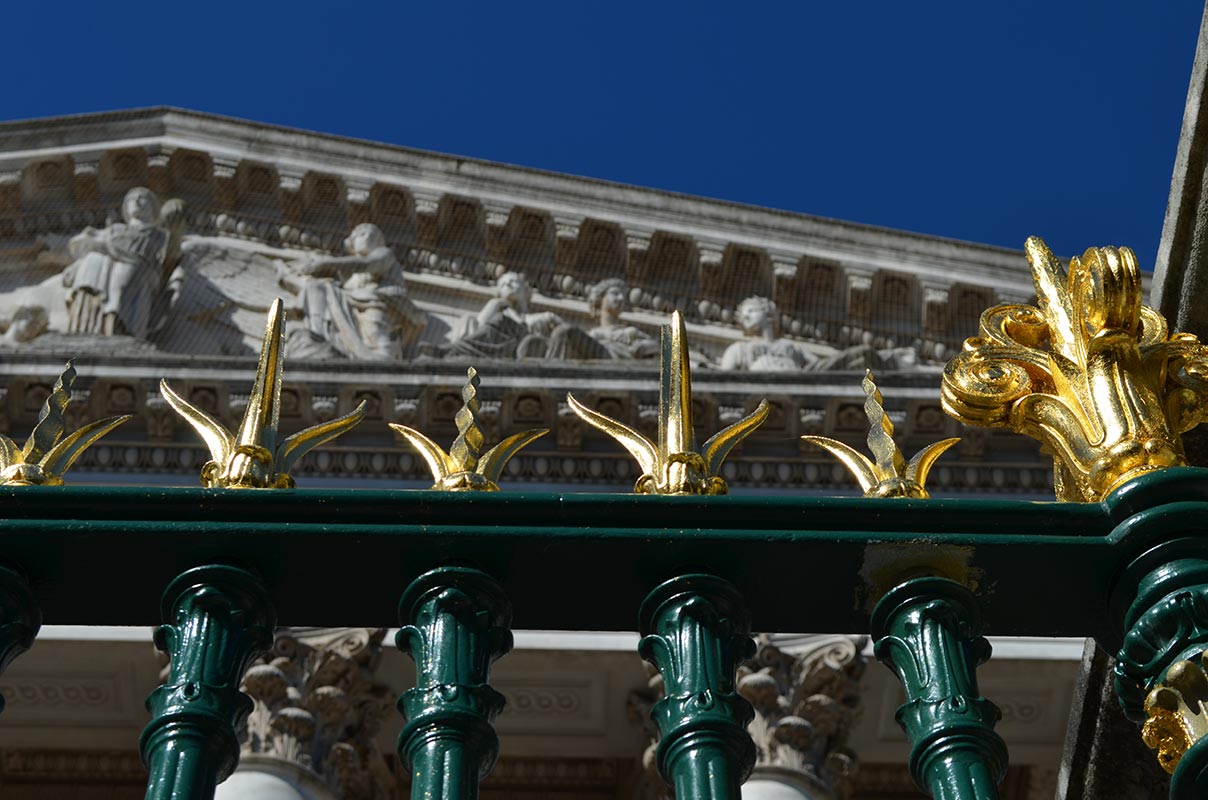 The restoration is as remarkable for the care and precision that has gone into it as its finished appearance. The layers of paint on the railings, fine examples of early 19th-century ironwork, were analysed in order to find their original colour, a bronze green and gold for certain elements. The railings were repainted in that green, originally aimed at imitating patinated bronze, while the wavy spikes topping them and large pineapple finials were highlighted with gold leaf. The coffered ceiling, adorned with a cornucopia of pineapples, melons, grapes, and apples, in such abundance that they seem to be almost bursting out of their frames, was restored, cleaned and consolidated. The same goes for the frieze spanning all round the top of the walls of the portico, depicting a playfully intricate combination of putti and their dogs chasing stags, boars and other wild animals amidst a lush stylised foliage of acanthus leaves. The museum produced a series of panoramas before taking down the scaffolding allowing the viewer to fully appreciate the virtuosity of the design.