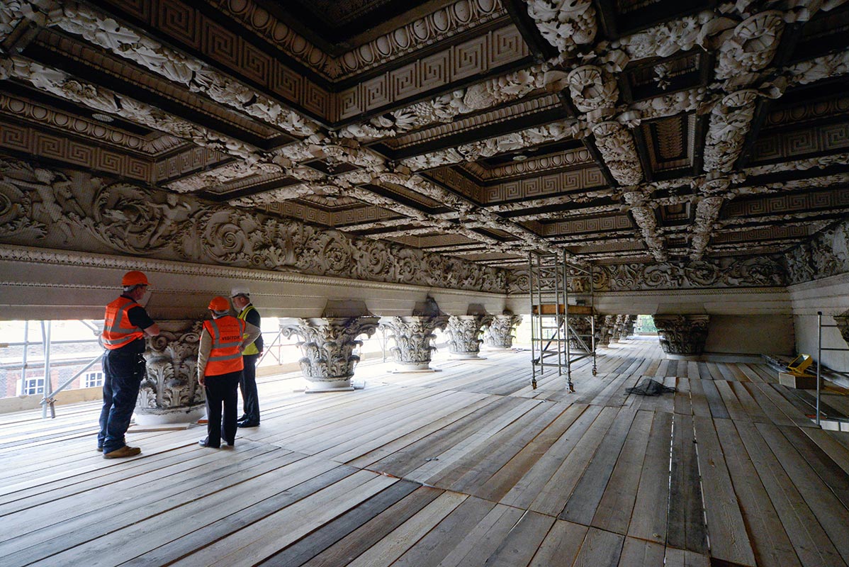 This very successful restoration will have a large impact on how visitors perceive their entrance into the museum. For many years, most visitors, myself included, have rushed through the gates on Trumpington Street failing to notice the intricate railings concealed by thick layers of black paint. Visitors then tended to rapidly ascend the steps through the darkened portico missing the elaborate carvings of the ceiling, hidden under dust and soot and obstructed by pigeon netting, serving the dual purpose of keeping the birds away as well as catching falling pieces of 19th-century plasterwork. The visitors’ first sense of awe would only be experienced once confronted with the main entrance foyer with its staircase rivalling that of the Palais Garnier, the dome supported by telamones, the luxurious variety of precious marbles and pairs of caryatids leading to the grand exhibition galleries.