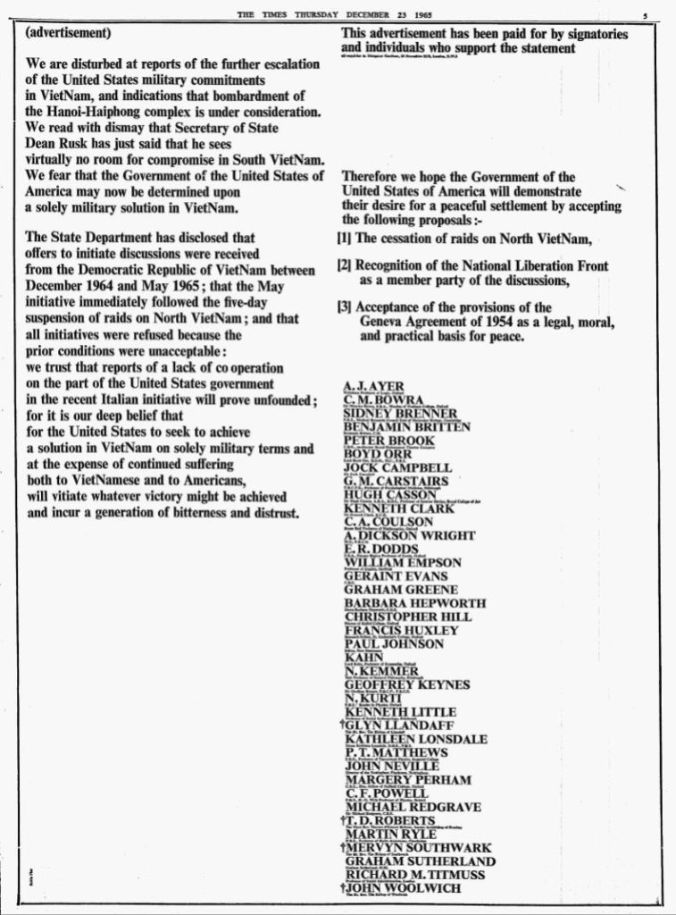 Bowen notwithstanding, Gardiner felt that only famous names – preferably of artists and intellectuals of all kinds – carried suitable heft. Her third advertisement in the London Times on 23 December 1965 deplored ‘reports of further escalation of the United States military commitments in Vietnam’. Designed by the radical typographer Robin Fior at the suggestion of Vanessa Redgrave, it was visually dramatic. As Fior recalled, the advertisement ‘was set in two columns of Times Bold with signatories’ names in Bold Titling, while their titles or honours were set in 6 points below the name, with perhaps 2 points before the name following. There was a crucial horizontal alignment between the columns. All this was carefully drawn in ink on medium-weight tracing paper and duly delivered to the head of the composing room, who received it without much enthusiasm […] But it was printed two points out of alignment.’ Unaligned or not, the effect was powerful, as was the array of names with a pronounced emphasis on academics and the clergy. Hepworth and Graham Sutherland were the only two visual artists.