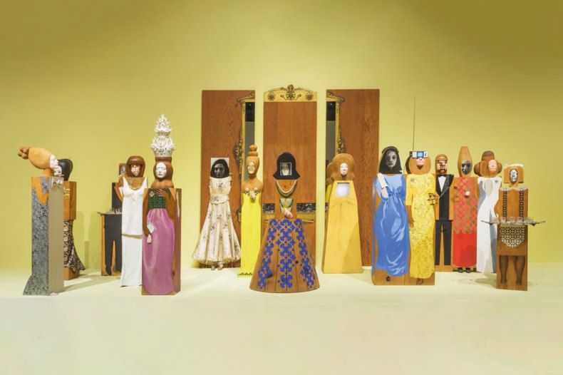 Marisol’s art, on the other hand, suggests boundless latitude: her face could appear anywhere; she could be anyone. The Party (1965–66) may be her most ambitious work. The elaborate assemblage comprises 15 freestanding, life-size figures and three panels set against the wall, fitted with the edges of a large mirror and, on one end, with a real dress and an image of a woman’s (Marisol’s) face. The figures are arrayed as if at a cocktail party and are dressed in evening gowns, save the male and female pair serving drinks and a single male guest in tuxedo. All bear images of Marisol’s face. One figure has a lightbox installed in her chest, illuminating a picture of a Harry Winston diamond necklace. On another, a picture of a drink is collaged on to one side of her wood torso, while a man’s hand reaches across from the other side toward her breasts, which have been moulded from grapefruits. A third has a small television in place of her face, but the screen displays only static. None of the figures interact; each is her own island. Does the television tuned to a dead channel signify this disconnect? Or is that particular woman simply checked out? In the catalogue, Jessica S. Hong reads The Family (1962) as a ‘performance of the ideal middle-class version of an American family, one familiar from popular programs of the era such as Leave it to Beaver (1957–63) and The Donna Reed Show (1958–66)’ – an observation that could also apply to The Party. The work has an undeniable allure; when Marisol showed The Party at Sidney Janis Gallery in 1966, 3,000 people reportedly stood in line to see it.