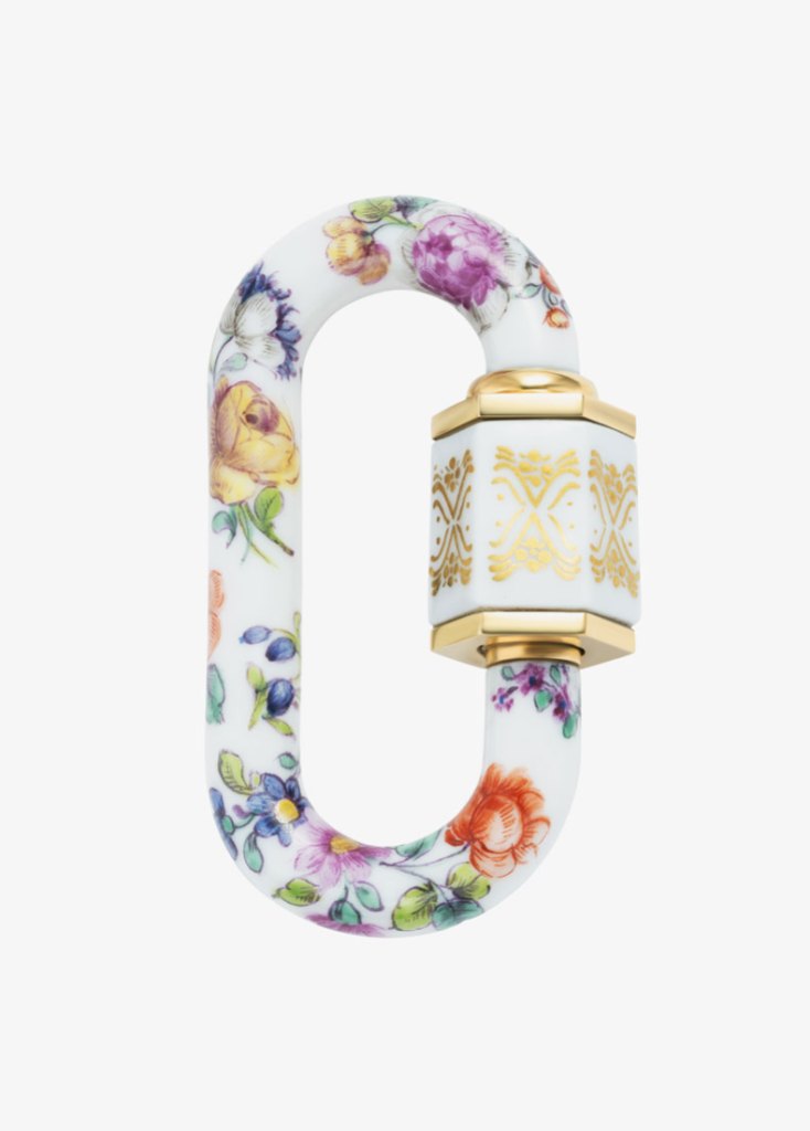 Nymphenburg has, in the past, worked with artists and designers such as Damien Hirst and Vivienne Westwood. However, adapting the Cumberland pattern for jewellery required selected expert artisans to scale it down and work with even greater precision, ensuring its character remained intact when miniaturised. Once painted, the tiny, fragile porcelain pieces were shipped to New York’s Diamond District, where Aaron’s team painstakingly assembled them into functional jewels – ones that could open, close and hold charms – while remaining intact and easy to handle.