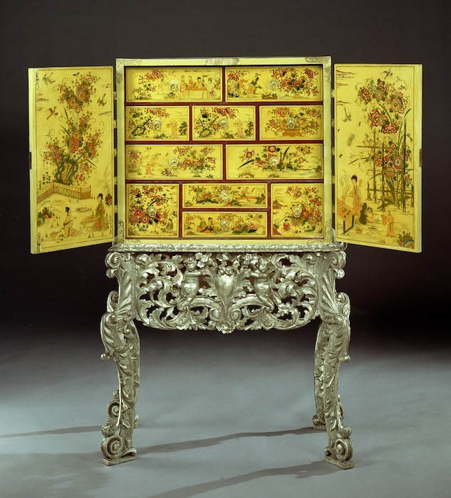 Cream japanning is rarely seen on English furniture – few workshops of the period were skilled in its production. The polychrome scenes that adorn the two folding doors, of chrysanthemums and oriental courtly ladies, were probably traced from Chinese or Japanese import china.