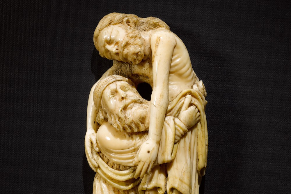 Ivory, and walrus ivory in particular, is warm in tone and semi-translucent, with much of the character of human flesh. It is also of fixed dimensions: rarely more than 8cm across and with limited straightness – tusks being curved. Any composition thus has to be contained within parameters that require arms, legs and heads to be placed in close proximity. The medium encourages intimacy. It is clear from the sculpture before us that this was not considered as a constraint, but as an opportunity. But the carver also had to find the technical means to convey sentiment. The gently furrowed brow of Joseph and his worried eyes and mouth are surely the result of the first-hand observation of living models. The telling details of Christ’s curling toes, looking as much alive as dead, alert us to his face and an expression that combines pain and repose, neither in death nor life but their reconciliation.