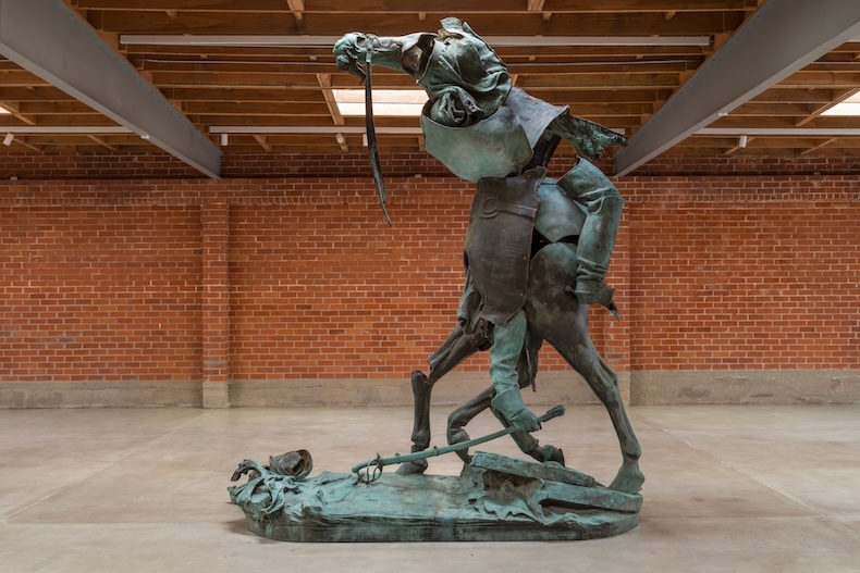 One answer is found in Kara Walker’s treatment of a statue of Confederate martyr Stonewall Jackson. The bronze statue previously stood outside the county courthouse in Charlottesville, Virginia, and when calls for its removal were approved by the city council in 2017, it became the focal point of a notorious and deadly white supremacist rally. After its removal, Hamza Walker, director of The Brick, arranged to give it to Kara Walker as the most loaded and historically charged of raw artistic materials. She sliced apart and reconstructed the general and his horse, creating a monstrous cubist tower of dismembered arms, hooves, armour and haunches, with Jackson’s faceless head hanging from the horse’s neck. Details like the prominent veins on the horse’s leg and deep creases in Jackson’s boot are rendered uncanny in their jarring positions, while the title, Unmanned Drone (2023), asserts that such statues are weapons, sent into public spaces to intimidate and oppress.