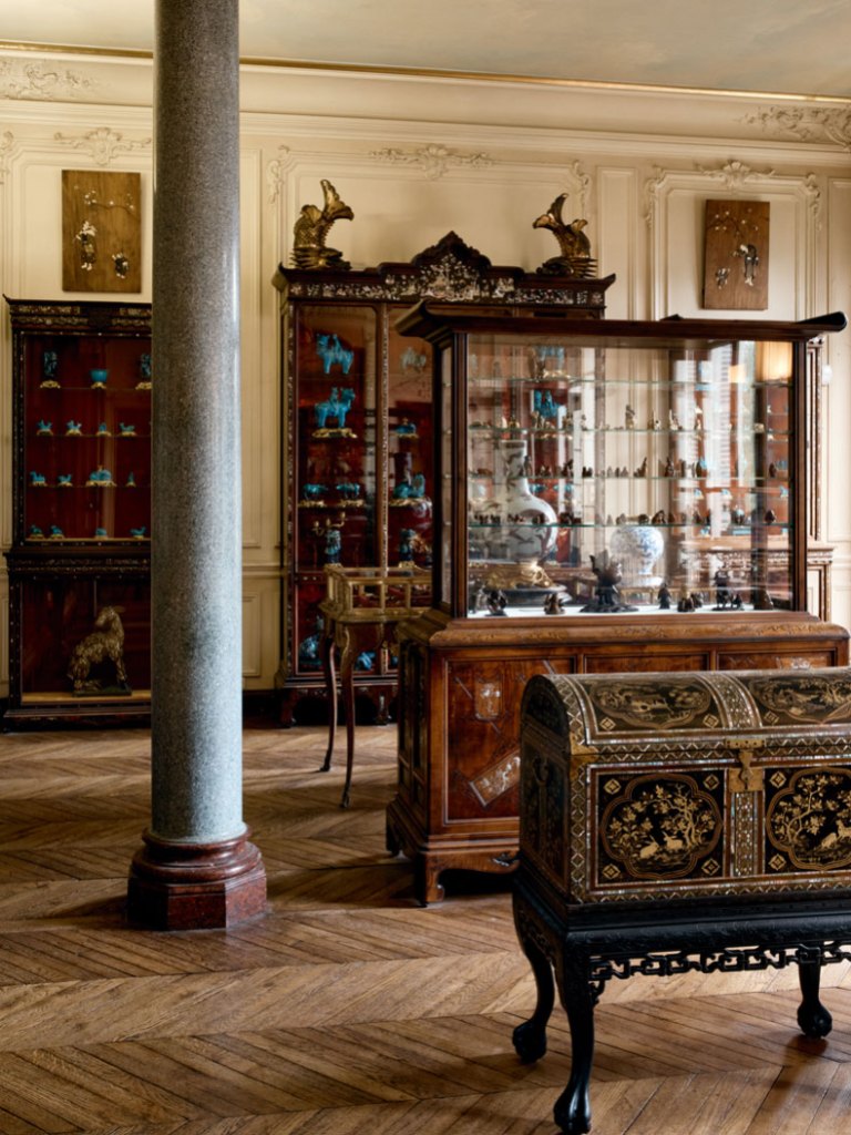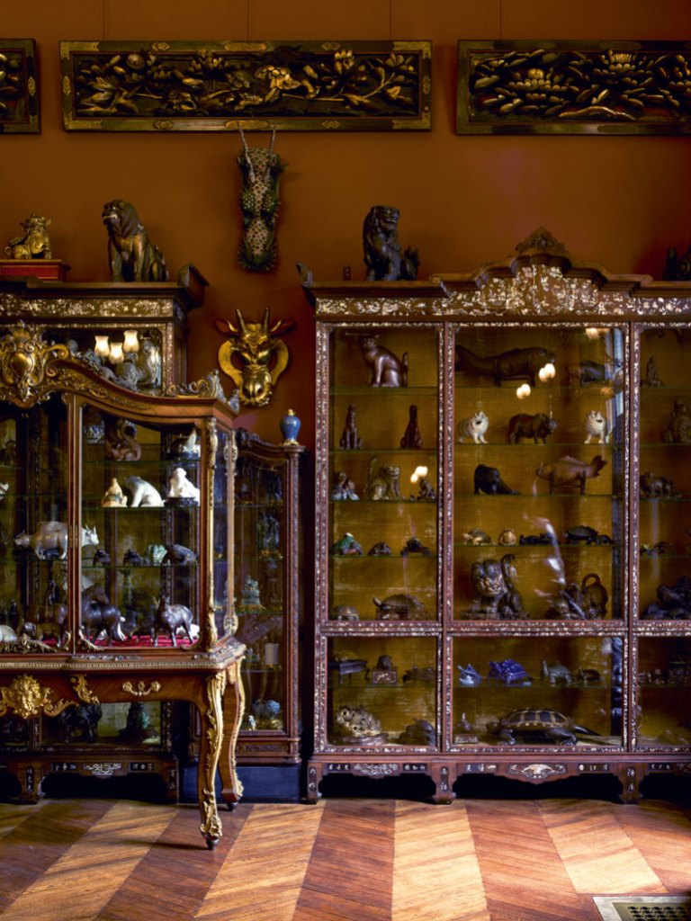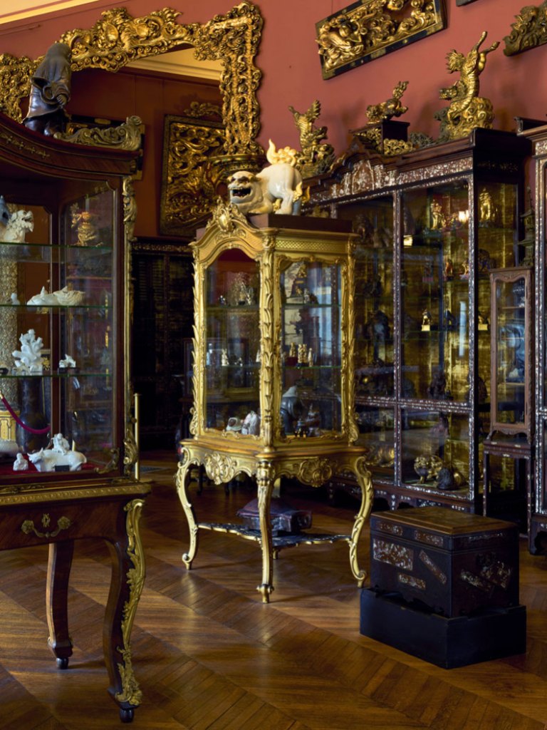 There are three types in evidence. The netsuke have special, lower cases, with a ziggurat built up inside to display a pyramid of Japanese craftsmanship. Porcelain and other crafts are displayed in vitrines made by the cabinet maker Gabriel Viardot (1830–1906). As the director of the museum, Pierre Baptiste, says, he ‘was a French man who began to develop a company buying oriental furniture, mostly Chinese and Vietnamese, and transforming them into French, fake oriental furniture’, essentially ripping off the mother-of-pearl panels to add in to his French cabinets. Clémence, however, went one step further, commissioning carved creatures on top of the vitrines that emulated what were thought to be classic ‘oriental’ designs. The final and most incongruous vitrines are in the final room, covered in gilt and in the style of Louis XV.