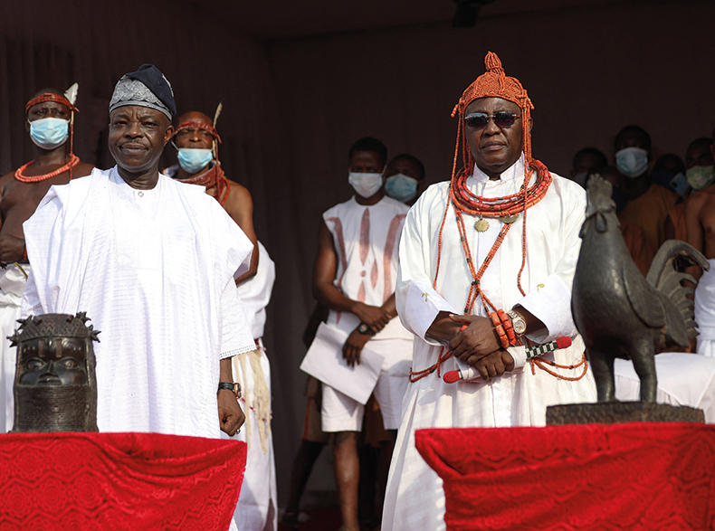 Oba Ewuare II (right), receiving restituted Benin Bronzes from Aberdeen and Cambridge universities in a ceremony in February 2022. Photo: KOLA SULAIMON/AFP via Getty Images