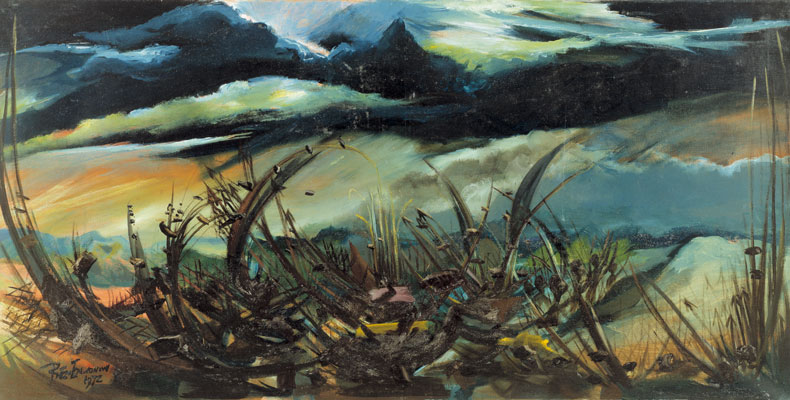 Enwonwu spoke of his decade-long series of portraits of wartime refugees, Children of Biafra (1966–76), as a kind of atonement for having failed to do more in the conflict. In a superb, brooding landscape on show at the Tate, Storm over Biafra (1972), he realised both an expression of elemental tragedy and a resounding call for national introspection. From the end of the conflict in 1970 until the end of his life, Enwonwu continued to express his belief in the potential of art to forge a multicultural, postcolonial Nigerian identity. His depictions of Igbo masquerades became ever more consummate in their essential rhythm, their harnessing of both modernist and African strategies of geometry, composition and colour to enact the spirituality of movement. Most significantly, after falling in love (unreciprocated) with the Yoruba princess Adetutu Ademiluyi, granddaughter of the Ooni of Ife, he painted her portrait in 1974. With her calm yet ambiguous glance back over her shoulder, wearing elaborate stately clothing and headdress, it is no surprise that Tutu – prints of which soon came to adorn homes throughout Nigeria – has been dubbed the African Mona Lisa. Seen in the Biafran context, it is also, as Ben Okri has written, ‘a symbol of the phoenix rising’.