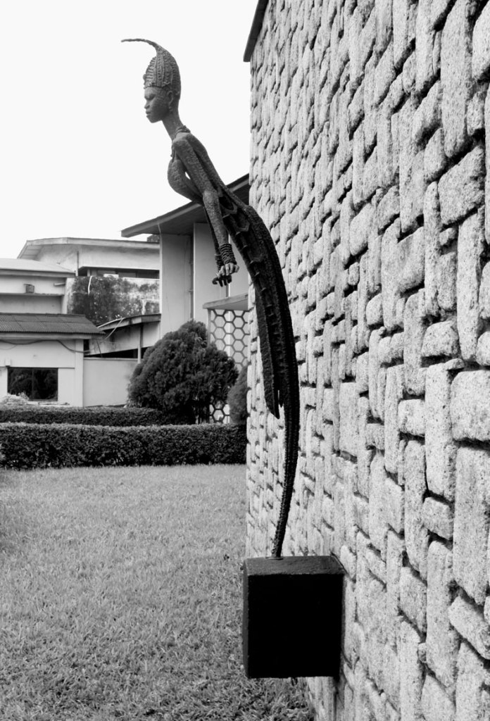 Enwonwu also embarked on successful exhibition tours of the United States and developed a friendship with Léopold Sédar Senghor, the poet of Négritude and future president of Senegal. All of these influences were perhaps first fully harnessed by Enwonwu in Anyanwu (1954–55), one of his earliest sculptural masterpieces. Installed in front of the National Museum, Lagos, Anyanwu presents in bronze the sinuous, elongated form of a female figure. Her head is derived from the famous Benin portrait sculpture of Idia, the Queen Mother; her body is at the same time a reworking of an earlier Enwonwu painting, a response to the pan-African aesthetics of the Harlem Renaissance, an Igbo salutation to Anyanwu (the sun), and a Senghorian hymn to the Black feminine ideal. For Enwonwu, it symbolised ‘the rising nation’.