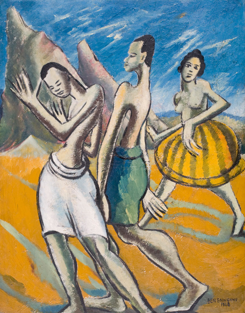 Survival seems always to have been an issue for Enwonwu. He was ‘bound’, he said, to express ‘the political aspirations of his time’ – and ‘for such expressions to be true, they must be an embodiment of the struggle for self-preservation’. By the time of his exhibition at the Marina Center in Lagos, 1949, he had developed a mature and distinctive style in both painting and sculpture. The Africa Dances series, begun in 1949, marked the beginning of a painterly obsession with the Onitsha-Igbo masquerade tradition that would last until the end of his life. He continued producing works with the title Africa Dances, while focusing in later years on masquerade characters, as in the series begun in the 1960s named after Agbogho Mmuo, the maiden spirit, or his works of the 1980s–90s depicting the male spirit Ogolo. His portrait sculptures in ebony or Indian mango wood exhibited a deep engagement with architectonic forms learned from African sculpture, which the British press considered to elevate him from the ‘pale copycat perversity’ of European artists looking at African art, and which gained him the patronage of Jacob Epstein.