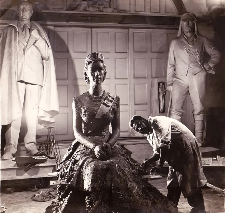 For readers of the West African Review, however, the sculpture meant something rather different. When the commission was first announced in 1956, the magazine declared that the ‘royal seal’ had been set on the ‘renown of West Africa’s most famous artist’. Where the Times saw in it a ‘requisite sense of regal dignity’, and the Daily Mail grumbled about ‘a distinct Africanisation of the features’, the Review praised it as a daring fusion of modernism with West African aesthetics. Photographs of the commission offer similarly contrasting perspectives. One shows the artist in overalls, crouched beside the nearly-finished figure in clay while being glared down at by Reid Dick’s neoclassical sculptures of David Livingstone and Franklin D. Roosevelt at the back of the studio. Another shows Enwonwu in a three-piece suit, standing beside the fur-coated Queen at the private view. As they gaze up past the bronze folds of dress to the figure, they appear to share in a comfortable intimacy earned during the sittings. (While the artist directed her poses, the Queen asked congenially after his family.)