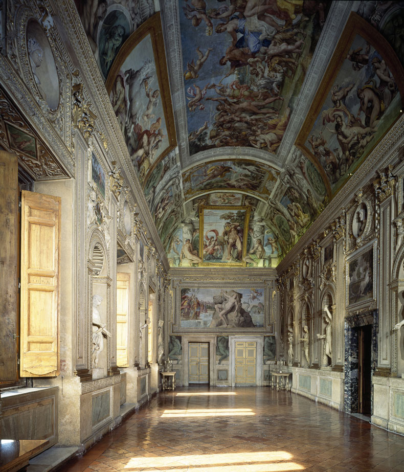 Juno and Jupiter, Diana and Endymion, Apollo and Hyacinth, Polyphemus and Galatea: the ceiling is a catalogue of mythological tales of lust and love in varying degrees of success. Above a window looking out towards the Tiber, Anchises – punching well above his weight – seduces Venus. They are framed by monochrome illusionistic statues that belie the conceit by holding decidedly un-statue-like poses, as if a poorly trained regiment were fidgeting on parade. Carracci winks at us: they are pretending to be statues, he says, but they are not trying that hard. Anchises removes Venus’s sandal, looking at her with hungry eyes; below, a stool bears an inscription from the opening lines of the Aeneid: genus unde Latinum (‘from whence the Latin people’). The fruit of their liaison would be Aeneas, ancestor of Romulus. All this apparent frivolity serves to entertain, but also to emphasise the antiquity of Rome, and of the Farnese as a Roman family.