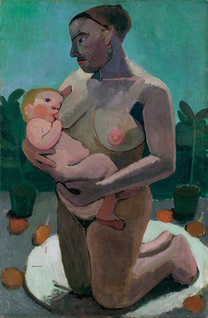 One of the last rooms in the exhibition contains eight self-portraits, several nudes of lithe girls and of mothers breastfeeding or reclining with their infants, and a wall of four still lifes, primarily depicting arrangements of oranges and gourds. Many of these were made in 1906, when Modersohn-Becker had left Otto and moved to Paris, feeling that Worpswede had become ‘too limited’ for her. (She returned to the village, and to her marriage, in 1907 and became pregnant.) In the galleries of Paris, she absorbed the work of Cézanne, Rousseau, Gauguin and Courbet and saw African art at the Musée du Trocadéro (at the same time as Picasso). The faces in her self-portraits from this period are rendered in impastoed layers of paint, swirling with greens, reds, pinks and yellows that provide dimensionality and emotion without the use of outlines or much shading. They summon her earlier drawings of old women, though now, in place of intricate charcoal lines, the faces are fulsome, incarnate.