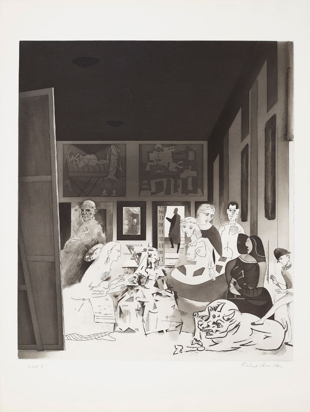 Another tour-de-force homage is Richard Hamilton’s Picasso’s Meninas of 1973. Picasso’s scrutiny of Velásquez’s masterpiece had led to some 44 works of art. Hamilton had seen Las Meninas at the Prado in 1972. He wrote: ‘The temptation to paraphrase Velásquez in Picasso’s styles proved irresistible…Las Meninas provided an opportunity to run the gamut of Picasso’s ‘periods’ in one plate – from ‘Rose’ through ‘Analytical Cubism’ to ‘Primitive’ to ‘Neo-Classical’ and so on…and the mysterious ambiguities…allowed some narrative interplay with substitutions of personalities as well as styles.’ Picasso has been substituted for the self-portrait of Velásquez working at the easel, the cross of St James on his chest replaced by a Communist hammer and sickle, and two of his paintings now decorate the back wall. In the doorway, instead of a watching Philip IV and his consort, Hamilton has inserted himself and his girlfriend, executed in a particular etching technique invented by Picasso.