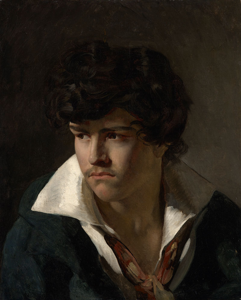 This rediscovered portrait was long thought to be a portrait of the young Delacroix, and although the jury is still out the evidence is compelling. The dark, brooding, deep-set eyes and the sulky cast of mouth appear to resemble two self-portraits, and the younger artist is known to have modelled for Géricault in preparatory studies for The Raft of the Medusa (1818–19). Alexandre Dumas also records the artist’s abundant black hair and wild, feline eyes.