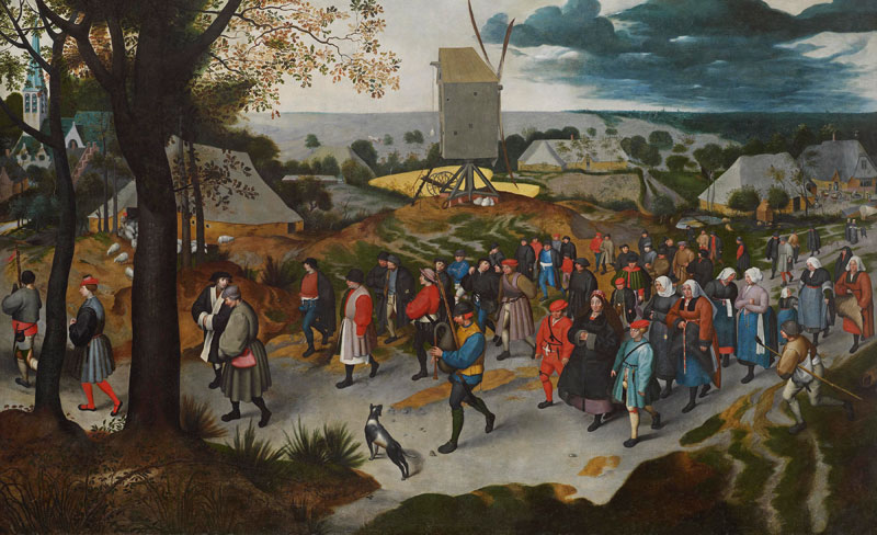 Like his illustrious contemporary Pieter Bruegel the Elder, Marten van Cleve favoured scenes of peasant feasts and celebrations. As was customary, the bride and groom walk separately, each accompanied by a man playing a doedelzak, and this instrument – along with the church bells, windmill, birdsong, footsteps, and laughter – can be heard in the music the gallery commissioned from William Lyons to accompany this recently rediscovered monumental painting.