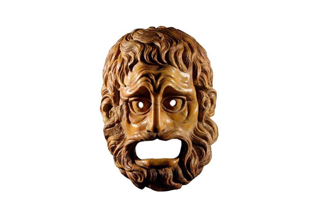 Over life-size sculptures of theatrical masks were used to decorate not only public buildings, including theatres, but also the courtyards of patrician Roman houses, as frescoes in Pompeii reveal. Like those worn on stage, they present intensely exaggerated facial features and expressions that could be read from a distance.