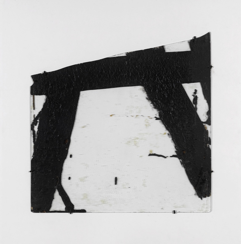 The earliest paintings here dramatise the exclusion of light. Goudron sur verre (‘Tar on glass’) is the title shared by two works from 1948. Both consist of broken shards of glass over which swipes of black paint have been forcefully applied. In Encre sur papier (1949) background light seems to enter the painting from behind a pair of shutters that have partly disintegrated. For Soulages, the view from and of an obscure interior is more interesting than whatever lies outside. He wants to remain in the dark.