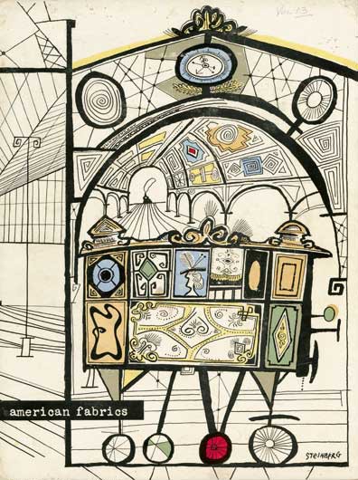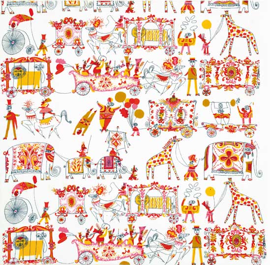 Other delightful highlights include Zandra Rhodes’s lipstick print textile, Andy Warhol’s food-themed prints incorporating purple watermelons and ice cream sundaes, and the humorous, colourful designs of the American satirical illustrators Saul Steinberg and John Rombola for Piazza Prints.