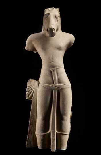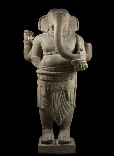 The Chinese had plenty of trading and monastic relations with the region, but in terms of culture this is, above all, a tale of Indian influence. Indian monks, sailors and merchants braved the Bay of Bengal waves to introduce the philosophies, rituals and artistic blueprints of Buddhism and Hinduism to Southeast Asia. Each kingdom, it seems, mixed this cultural basket of goodies with existing animistic beliefs to develop their own sculptural styles, their own cults. One was Ganesh as the powerful and dangerous Ganapati (represented here by three dynamic sculptures); another was Vishnu’s final avatar Kalkin (a monumental, sleek horse-headed figure from South Cambodia is on display); still another is Krishna raising Mount Govardhan (as seen in the almost Hellenistic, over life-sized, humanist figure found in a rock-cut cave at Phnom Da in 1944).