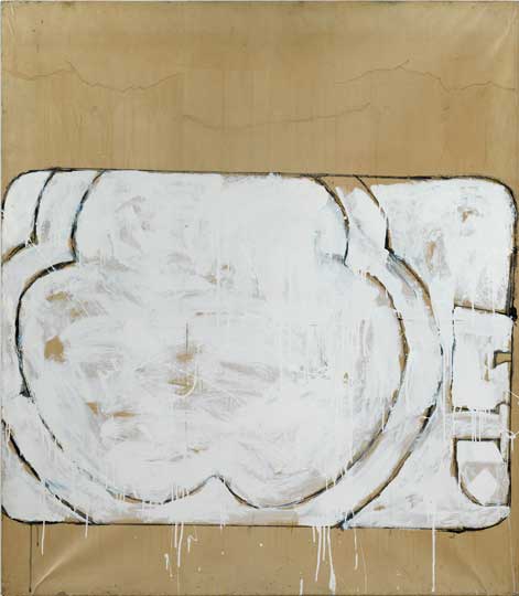 Schifano is often associated with Pop Art due to his use of the Coca-Cola and Esso logos in his mid-1960s work, but this small exhibition brings together key examples which show what came before and after. At the start of the ‘60s Schifano found success with his large monochromes and abstract forms, which attracted the attention of the dealer Ileana Sonnabend. Despite the experimentation with flatness and depth, these canvases are quite unlike colour field painting; his gestural and dripping enamel paint is more reminiscent of Jasper Johns and Robert Rauschenberg. Schifano’s use of cheap canvases, which he covered in parcel-paper, creating a grid-like effect and an uneven surface, is indicative of his early material experimentation.