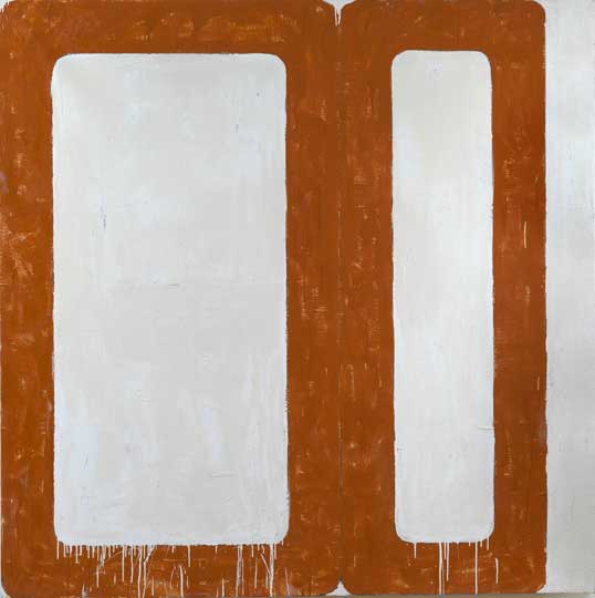 While the exhibition showcases the changes in Schifano’s style over a short period, signs of continuity are still apparent: his loose brushstrokes, unusual materials, motifs which display and conceal the canvas, and preference for certain colours, in this exhibition cyan and terracotta. Throughout the period Schifano also succeeded in synthesising many aspects of European and American modernism, while resonating with the concerns of post-war Italian art; his experimentation with materials and reflection of Italy’s post-war social and economic changes are shared with the artists of Arte Povera as well as Lucio Fontana and Alberto Burri. Given the recent popularity of such artists in London, Schifano’s star should also be rising.
