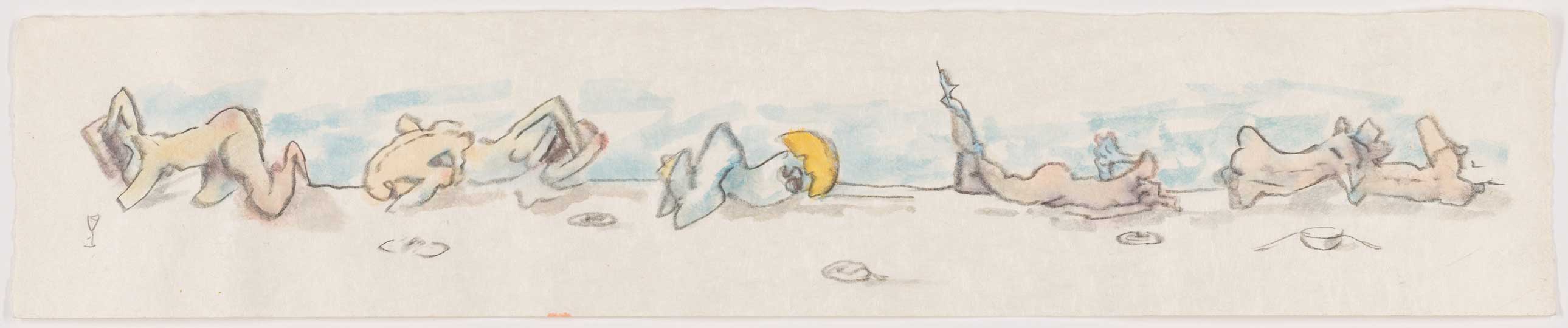 Meanwhile, the (later) works of Dorothea Tanning on display take on sexual taboo from an entirely different perspective. Her sculpture Traffic Sign and work on paper ‘Studies for Hôtel du Pavot, Chambre 202’, both from 1970, exploit surrealism’s sense of play and its embrace of incongruous juxtapositions to poke fun at the power of the female body over those who desire it.