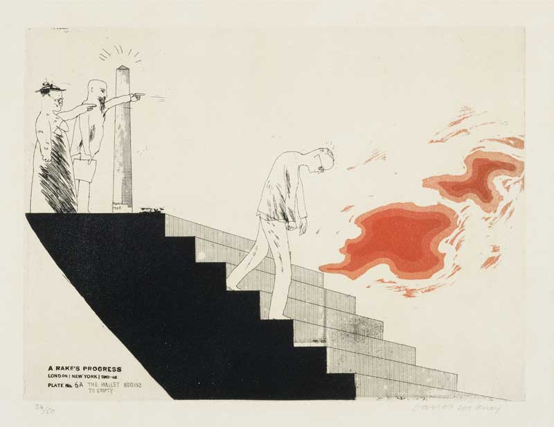 The contemporary responses to Hogarth’s series collectively form their own ‘progress’, providing a shifting set of perspectives on today’s social values. Hockney’s is the most autobiographical, describing the adventures of a callow young artist visiting hedonistic New York for the first time. The progress here is towards a desired loss of innocence, but also towards social conformity.
