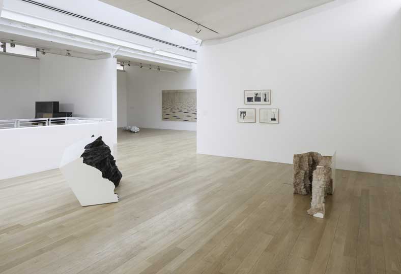 This tension similarly infuses works at the other end of the scale in ‘Oceans’, notably several watercolours on graph paper. In places, the gridded lines constrain the watery pigment’s movements, but at others the colours languidly unfurl like smoke and break through the geometrical structures. In a related series, Kovats has given the making of the drawing over to evaporation, soaking paper in water, ink and salt before leaving it to dry. The resulting pieces retain a residual mineral glitter, while the paper attains a thickness that is almost sculptural.