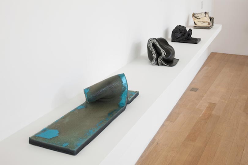 For all the diversity of materials – ceramic, maps, ink, watercolour – ‘Oceans’ consistently returns to moments of uncanny stasis (the calm before the storm) amidst febrile movement. Kovats’ group of Schist sculptures – reminiscent of Lynda Benglis’ Polyurethane pours – suggest rock strata, shifting ocean-floor sediment and crumbling cliff formations. Their gelatinous surfaces, enlivened with the glitter and sparkle of the tawdry resorts that Britain does best (Margate, Weston-Super-Mare, Blackpool, Cromer), imply that while they might be still for now, they won’t be for long.