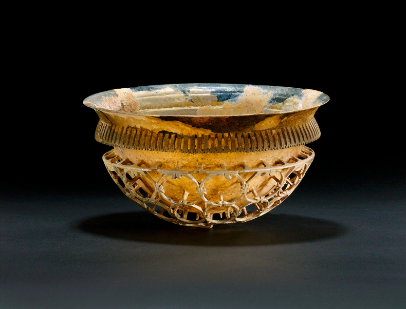 Glass as a material dates back to at least the second millennium BC in Mesopotamia and Egypt. Glass beads were widespread and core-formed glass vessels were luxury items, the shapes created by heating ropes of glass over a sand and clay form, with sometimes elaborate contrastingly coloured decorative threads smoothed into the hot surface, and handles and feet added. In the first millennium BC, the Greeks and Phoenicians developed glass technologies further, including ‘slumping’ viscous glass over a mould and cutting bunched canes of glass cross-ways to produce mosaic-like millefiori decoration. All these techniques the Romans inherited from the eastern Mediterranean in the early days of the Republic. They added an interest in refining new types of monochrome and colourless tablewares. Other specialisms include the extremely rare and sought-after ‘cage-cups’ or diatreta, dated to the fourth century AD – tours de force of technique, consisting of an inner beaker and an outer decorative cage held by short stems. One of the few in private hands, the Constable-Maxwell cage-cup, achieved the auction record for a piece of ancient glass at Bonhams in London in 2004 when it fetched £2.6m against an estimate of £2m – it had twice before broken the record, in 1979 and 1986. This ‘cup’, once used as a lamp, was carved from a solid piece of glass in the third century AD.
