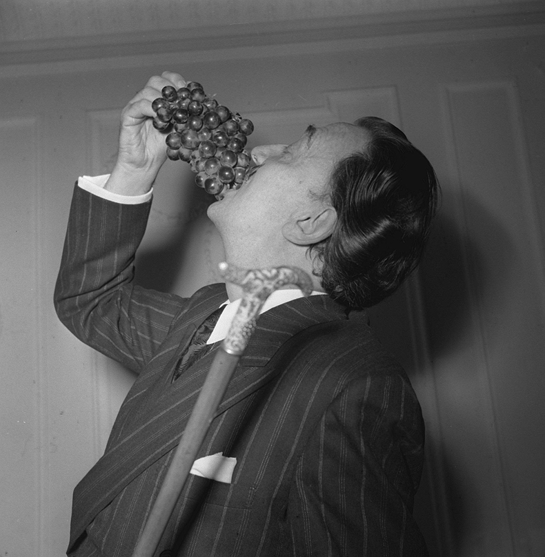 In his autobiography The Secret Life of Salvador Dalí (1942) the fruit is practically eroticised. He describes Gala, who went on to become his wife, eating black grapes on a dry stone wall and each grape making her ‘brighter and more beautiful’ until he feels her ‘sweeten in unison with the grapes on the vines’. The etching Lovers with grapes (1971) shows a bunch of grapes hanging, like mistletoe, over a couple about to lock lips.