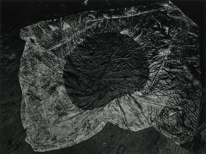 On the gallery wall, Kawada’s shot of a discarded Lucky Strike cigarette packet from The Map is mirrored by a similarly cropped photo of a discarded Japanese flag: both are abandoned and worn, their decay highlighted by the photographs’ intense dark tones, but both still clearly bear their iconic circle motifs. Kawada shot both from above, as the American pilots in the Enola Gay must have observed the city before dropping the bomb. But, being an American product dropped since the explosion, this packet presumably represented for Kawada the lasting cultural consequences of the bomb. The Allied nations occupied Japan up until 1952, and as Kawada was putting The Map together Japan was going through an economic recovery, partly due to trade with America.