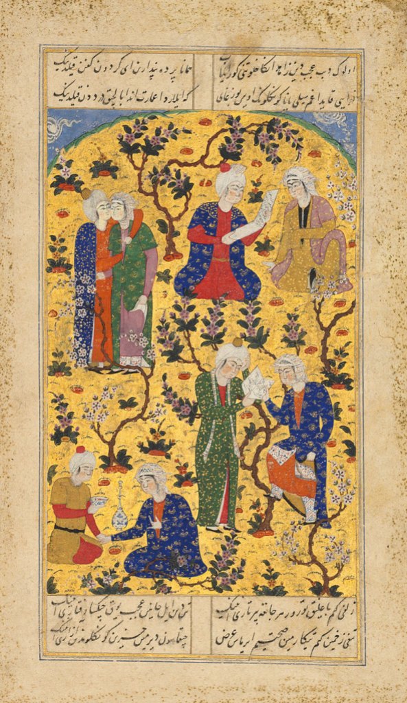 It is within the arts, however, that the connection between Shiraz and wine culture is strongest. Since the 14th century, when Hafiz wrote ghazals (love poems) while ‘drunk on the wine of the Beloved’, wine in Persian art had functioned simultaneously as an object of pleasure, a sign of cultivated sociability and a symbol of love, whether human or divine. Hafiz’s poems embrace pleasure, defiance and metaphysical intoxication: ‘I will not depart from love, beauty, and wine. I have repented a hundred times, and I will not do it again.’ He inspired artists and craftsmen throughout the dynasty, who created miniatures that included quotations from his poetry – often relating to drunkenness and merriment.