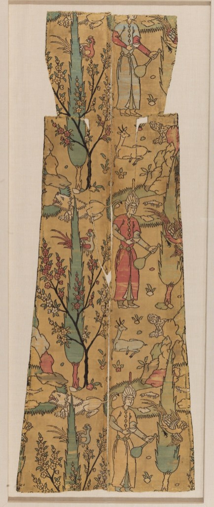 Safavid textiles also register wine as part of social interaction, etiquette and visual pleasure. A 16th-century silk fragment held by the Metropolitan Museum of Art shows a repeated image of a youth carrying a cup and a long-necked bottle through a lush garden world of ponds, birds, trees and animals. The figures and environment are visually interwoven: serving wine is not a separate act but part of an entire sensorial ecology of courtly life. Wine is not just for consumption but is designed into space and surface; it is an ornament and an atmosphere.