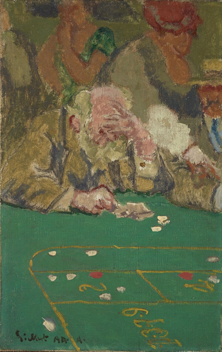 Until then, Sickert had been producing hazily elegant studies in the style of his teacher, Whistler. Degas painted unapologetically modern subjects using surprisingly traditional studio-based methods. You can spot his influence in the brilliant palette of The Red Shop (October Sun) (c. 1888); in the poses of numerous tired revellers; and most obviously in Dieppe Races (c. 1919–20). It is also apparent in Sickert’s prints and drawings – which are rightly given equal billing beside his paintings. It would have been interesting to see Sickert’s work compared to that of the artists he met in Dieppe. But then that would be a very different show.