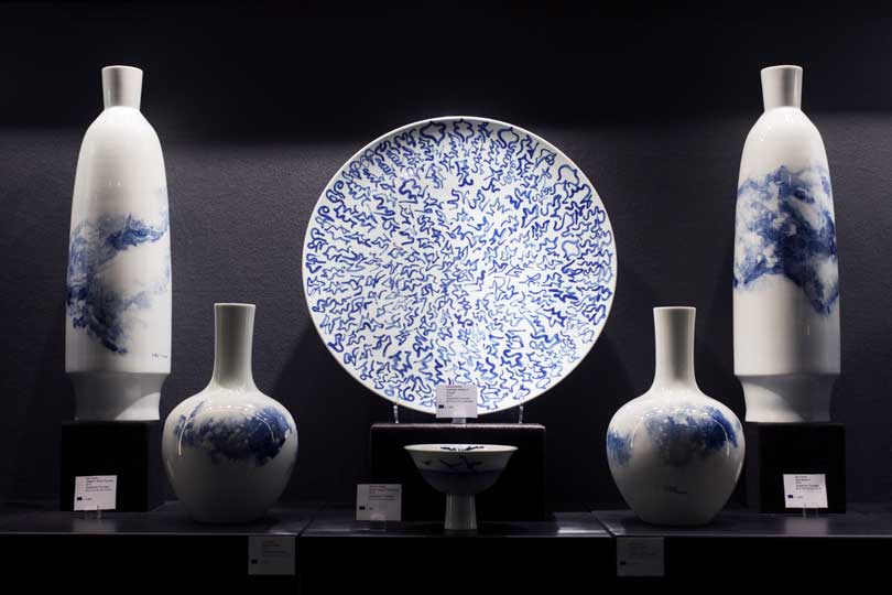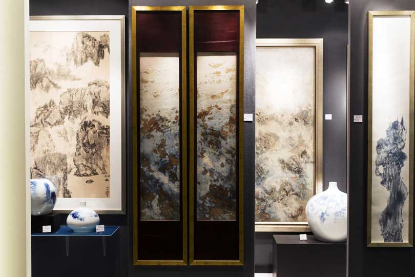 Porfirius’s display of rare, small items, which range from a magnificent natural fan of coral to an intricate, machine-turned wooden box made for the Tudor court, is compact and carefully clustered around the edge of the stand. FitzGerald Fine Arts is exhibiting contemporary Chinese porcelain and ink works, some of which measure over a metre, and has adopted an altogether different approach, partitioning the space to create a narrow snaking corridor. Visitors are obliged to edge past the wall-mounted pieces and standing vessels, whose invitingly smooth surfaces you are permitted to touch.