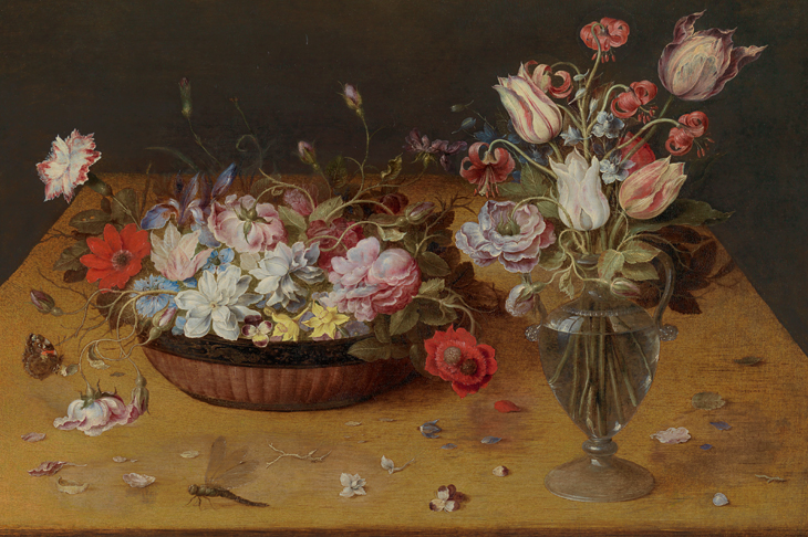TEFAF Maastricht is unimaginable without Netherlandish still-life painting, of which Beert’s tabletop tour de force is an early example. Little is known about this Ant- werp painter, whose oeuvre was only rediscovered in the 20th century. This panel reflects his penchant for complex flower paintings, of which six are known to survive. For these, a rich diversity of blooms are combined in two, three or even four different containers, and the vessels represented here reappear together in other works, not least the Pausias and Glycera in the Ringling, Florida, on which he collaborated with Rubens. As with nearly all such paintings, the varieties of flowers depicted – all 27 of them – could never have bloomed at the same time, nor would the leaves strewn on the table, or the insects, have flourished with these specimens. Artists often worked on different paintings over several months, or worked from sketches, drawings or prints. While symbolism is never explicit in Beert’s still lifes, the worm-eaten leaves, like the fallen petals, may imply a vanitas theme, and the butterfly and dragonfly could symbolise the liberated soul which, after a virtuous life, rises to heaven.