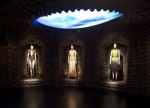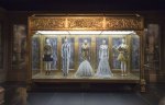 Most of the exhibition surfaces are black and highly reflective, so that your perception of what is projected film, what contemporary fashion, and what museum object becomes blurred and fractured. It is an onslaught of sensory experience, making you re-evaluate, and re-experience everything you see.