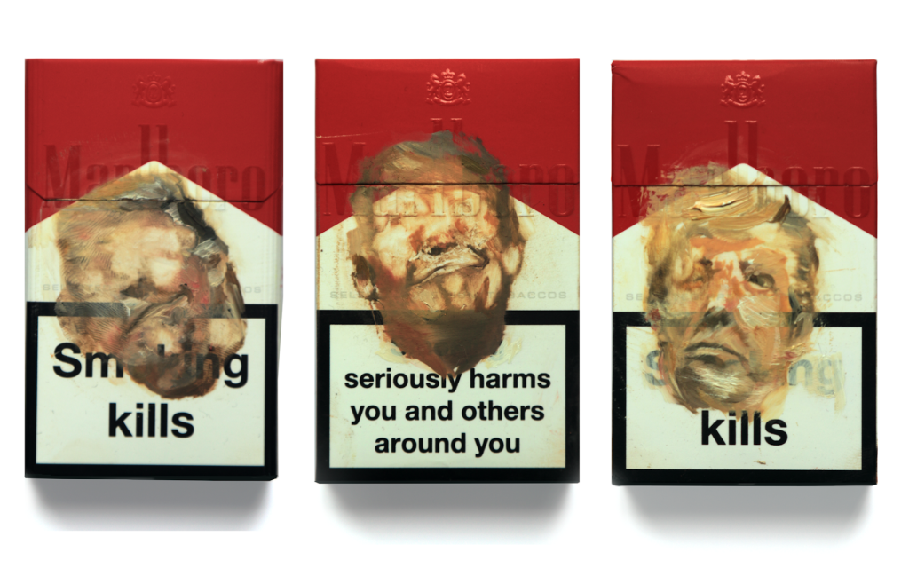 As with all great modern art movements, Donaldism’s reach has crossed the Atlantic. Invited to support the Peace One Day non-profit organisation, the British painter Antony Micaleff is auctioning a new work, consisting of Marlboro Red packs adorned with Trump’s visage above the warning that the Donald ‘seriously harms you and others around you’, or indeed ‘kills’. ‘Trump is the equivalent of Batman the Dark Knight who spends all his money and family wealth in fighting his cause, but instead of fighting for good of Gotham he fights for the throne of America,’ says Micallef. ‘People are so angry that they feel they have been giving nothing and are forgotten. They want a voice and no matter what Trump says, they will follow him as he is the vehicle for their hate and a perfect conduit to express it in.’