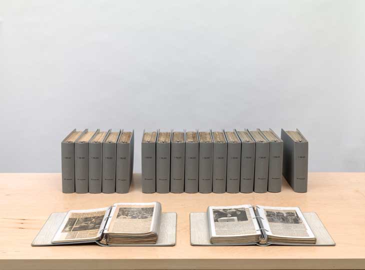 These document boxes offer a snapshot of the myriad stories and events marked by a single date. Recurring themes emerge, reflecting the circularity of current affairs as much as specific selections on Kawara’s part: ‘Israeli jets fight Egyptian planes over Suez Canal’; ‘white pupils are fleeing Mississippi public schools.’ This is reinforced when you arrive at the apex of the Guggenheim’s shell-whorl galleries – normally an intransigent space that here helps this exhibition’s engagement with reflexivity and return – where constellations of paintings and newspapers from different years within Today reveal repetitions within difference.