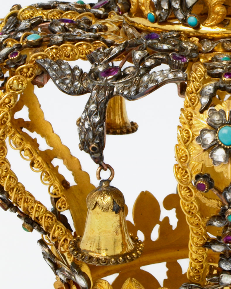 At the tip of the crown are small diamonds set in silver branches that are holding up the largest of all – an old mine cut diamond. The set of this gemstone is designed to resemble the head of a flower and, just like a flower, it trembles when moved. Combined with the bells, it makes this Torah crown a remarkably dynamic object.
