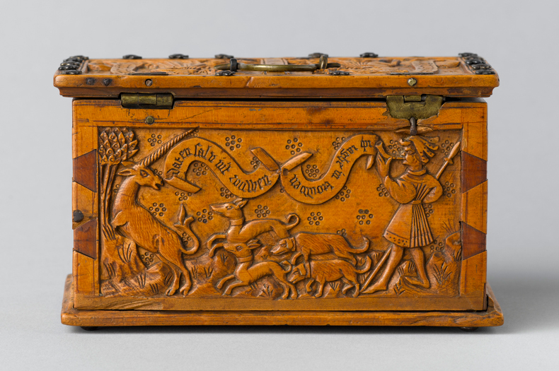 Rear panel of a box showing a unicorn hunt (c. 1500), middle Rhine. Musée de Cluny, Paris. Photo: Jean-Gilles Berizzi/GrandPalaisRmn (Musée de Cluny – Museé national du Moyen Âge)